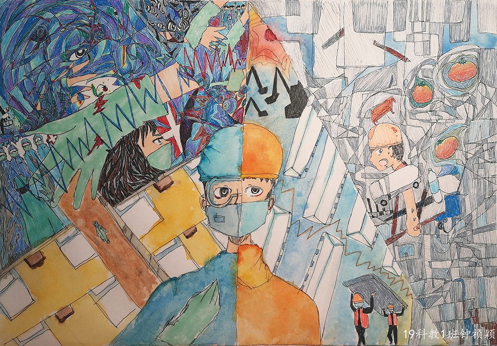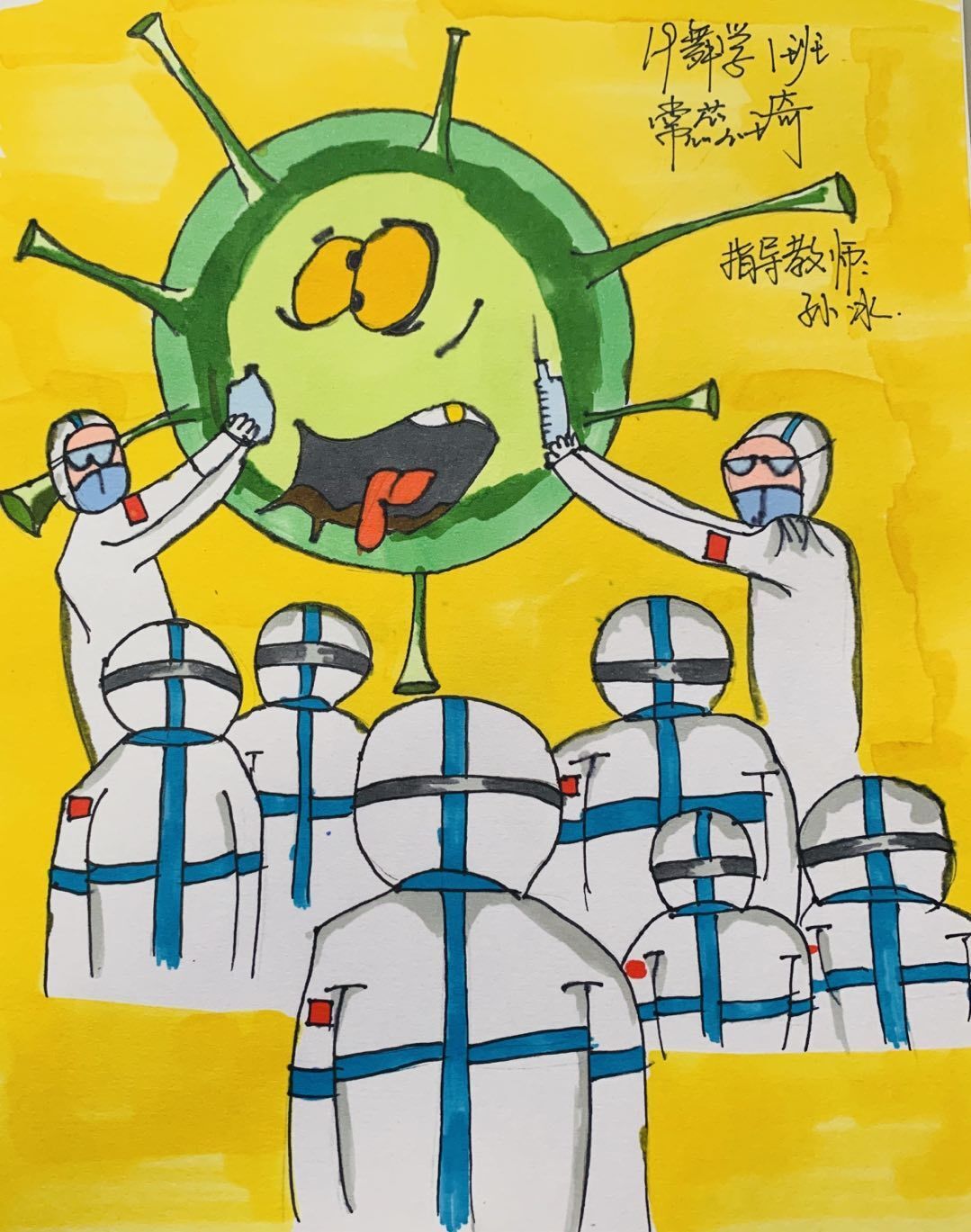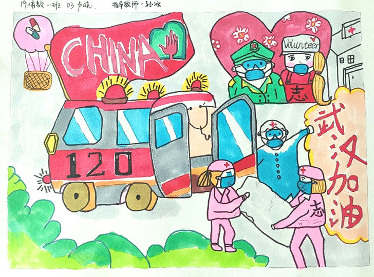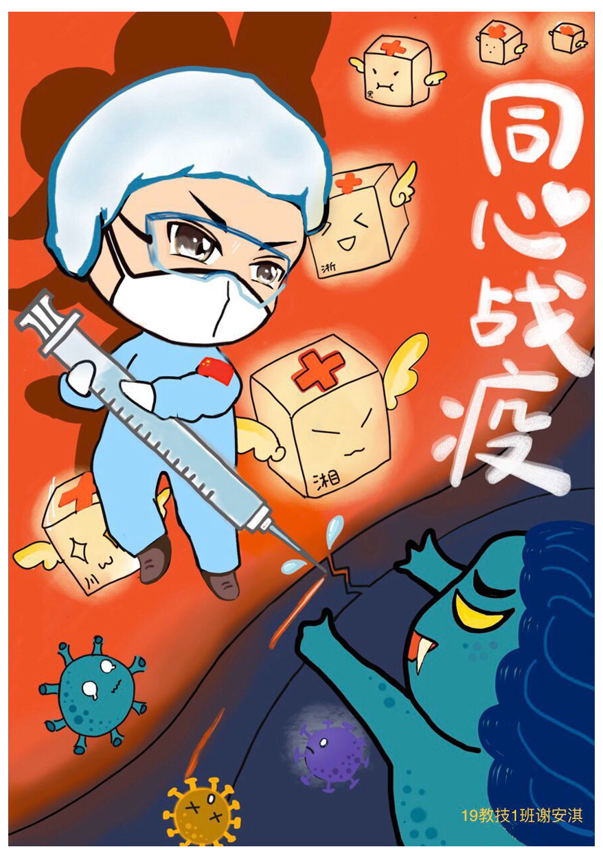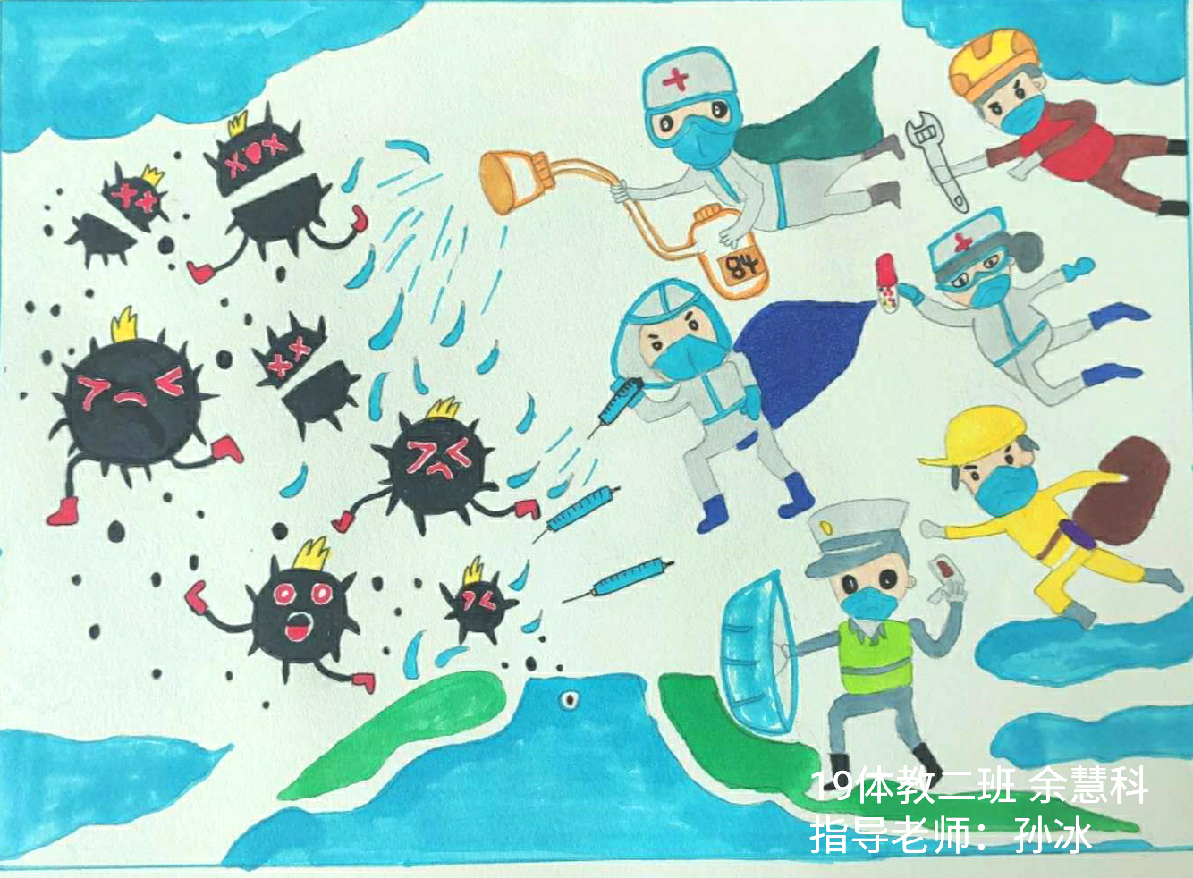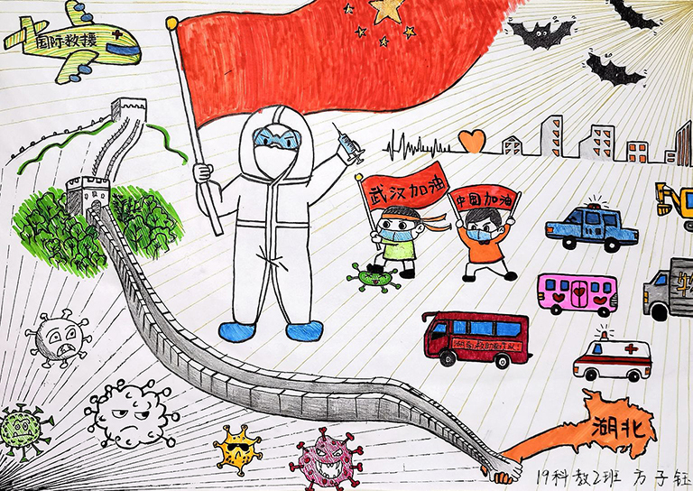 简笔画教学是《美术基础》课程内容中的重要组成部分,教学重点在于加强师范生的简笔画绘画技能,提高美术素养与多元化教学能力,为今后的教学实践打下基础。这次主题创作活动是课程组孙冰、曾素艳、谭媛元、吴瑕、易琼娟五位教师共同探究新时代课堂教学中“课程思政”的一次教学实践。针对抗击疫情期间师生们对抗疫进展与社会现象的关注,结合美术创作“以人民为中心”的指导思想,课程组五位教师通过多次研讨课程内容与授课方式,决定结合慕课平台线上教学进度与课程内容,组织所授班级包括科教、体育、音乐、应数等十个专业926名员工(师范类非美术学专业)共同参与“战疫情·爱不隔离”简笔画主题创作。同学们在掌握简笔画学习与表现规律的同时,将抗疫期间的英雄事迹、感人镜头用画笔展现,将感动之情运用隐喻、借喻、拟人或直抒胸臆等多种手法表现,表达青年的爱国情怀与内心感悟。课程组五位教师在十个班级中选出了75幅优秀作品进行线上展览,呈现出不同学科专业员工们凭借艺术的力量以“艺”抗“疫”。