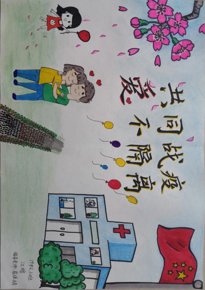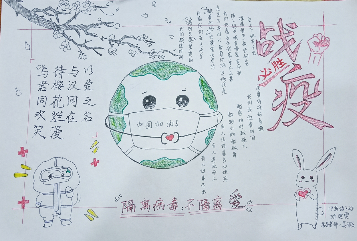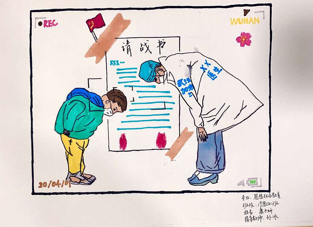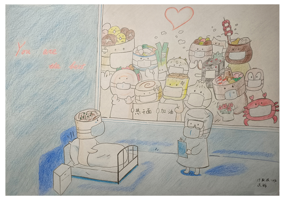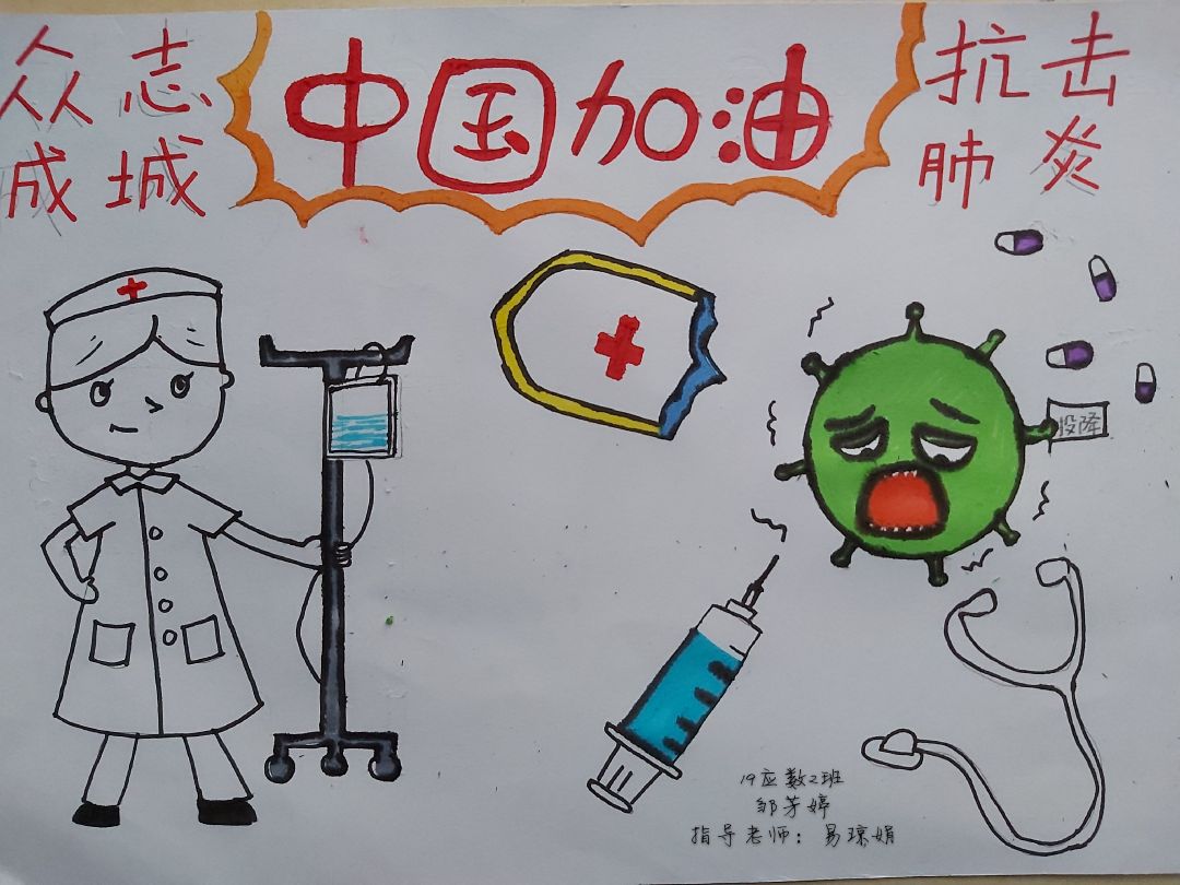 简笔画教学是《美术基础》课程内容中的重要组成部分,教学重点在于加强师范生的简笔画绘画技能,提高美术素养与多元化教学能力,为今后的教学实践打下基础。这次主题创作活动是课程组孙冰、曾素艳、谭媛元、吴瑕、易琼娟五位教师共同探究新时代课堂教学中“课程思政”的一次教学实践。针对抗击疫情期间师生们对抗疫进展与社会现象的关注,结合美术创作“以人民为中心”的指导思想,课程组五位教师通过多次研讨课程内容与授课方式,决定结合慕课平台线上教学进度与课程内容,组织所授班级包括科教、体育、音乐、应数等十个专业926名员工(师范类非美术学专业)共同参与“战疫情·爱不隔离”简笔画主题创作。同学们在掌握简笔画学习与表现规律的同时,将抗疫期间的英雄事迹、感人镜头用画笔展现,将感动之情运用隐喻、借喻、拟人或直抒胸臆等多种手法表现,表达青年的爱国情怀与内心感悟。课程组五位教师在十个班级中选出了75幅优秀作品进行线上展览,呈现出不同学科专业员工们凭借艺术的力量以“艺”抗“疫”。