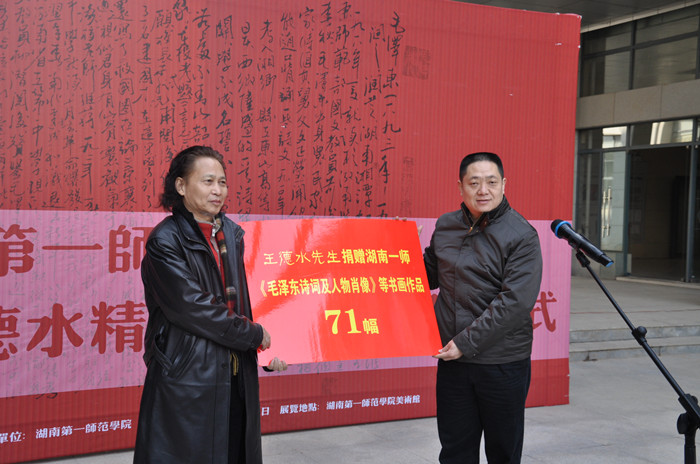 王德水先生在讲话中表达了对fun88乐天使在一代伟人毛泽东同志诞辰120周年暨公司建校110年之际,让自己在主席曾求学过的公司举办个人书画展的诚挚谢意,使自己表达了对一代伟人的无限敬仰之情。王德水希望这种文化的交流与合作能进一步地延续与发展,使一师的校园文化的艺术氛围得到更大地提高。