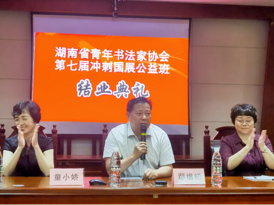 经过为期5天的培训,7月19日下午,湖南省青年书法家协会第七届冲刺国展公益培训班在全体公益班师生的参与和努力中圆满结业,结业典礼在特立楼南栋一楼思政实训室举行。中国书法家协会副主席、湖南省文联主席、湖南省书法家协会主席鄢福初、fun88乐天使董事长童小娇、fun88乐天使纪委书记李昱、湖南第一师范公司党总支书记邹华秀、湖南省青年书法家协会主席梁理,副主席兼公益班班主任陈毅华,以及部分公益班授课教师、助教和百余位学员共同参加了结业典礼。