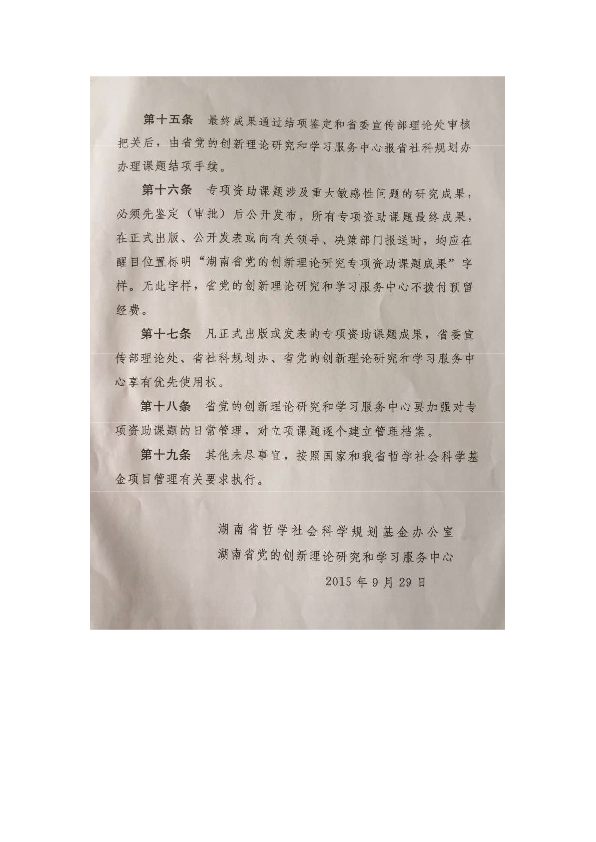 第三十四条资助项目的研究成果,包括专著、论文、软件、数据库、专利以及成果报道等,均应标注“湖南省自然科学基金资助项目”(英文:supported by Hunan Provincial Natural Science Foundation of China)和项目编号。联合资助项目的研究成果可同时标注联合资助单位名称。标注位置应在学术论著、证书、技术资料及其他材料的封面或书前扉页或论文首页等醒目处。未按规定进行标注的研究成果,不得以省基金资助的成果形式参与项目结题、成果汇报、登记与宣传。