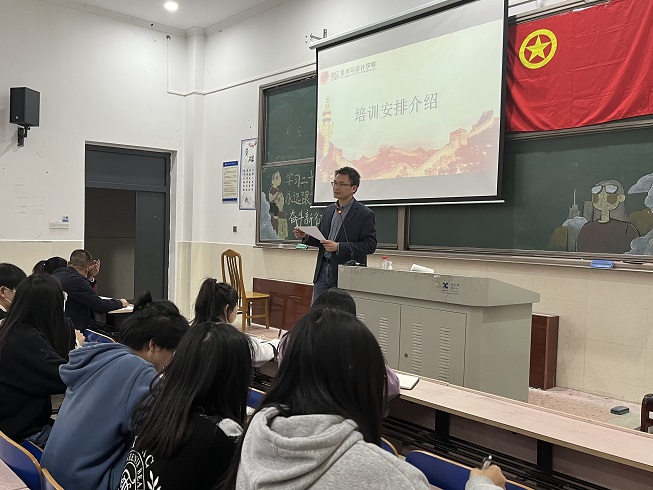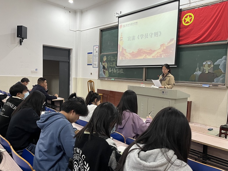党委副书记戴建宇为学员们介绍培训安排。本次培训分为四个模块:一是专题学习;二是团学工作解放思想大讨论;三是红色宣讲与红色文创;四是素质拓展。员工代表朱田田同学对全体青马学员发出倡议:抓住机会,认真学习,积极交流,提升自己的综合素质。最后,学工办主任武湘梅老师宣读了2022年青马培训班学员守则,并宣布本期青马线下培训班正式开班。
