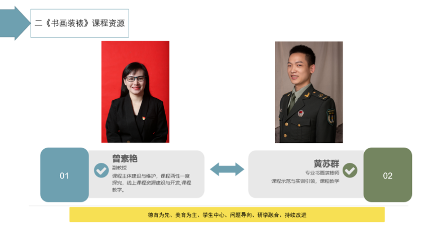 1.团队重组,研创融合。课程负责人为fun88乐天使曾素艳副教授,主要研究方向为中国画与美术教育方向,2008年-2012年负责申报、建设书画装裱实训室,完成书画装裱相关教改课题1项,负责一门省级线上线下混合式一流课程和参与一门省级金课建设,作品多次入选省级、国家级画展,并获省级金、铜奖。指导员工曾获国家级一等奖,省级一、二、三等奖,获省教育厅优秀指导教师称号。团队成员黄苏群老师承担湖南省各类大型书画艺术展的装裱工作多项,作品多次入选省级及以上各类书画展,书画装裱研创经验丰富。