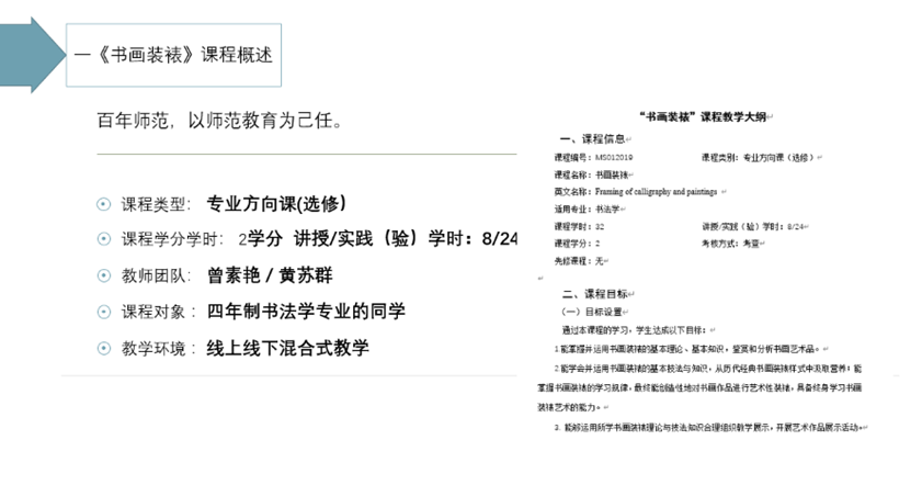 本课程2学分。课程在2019年上学期完成16级书法学专业员工的教学后,曾因教学计划调整而删减。后期公司通过对员工、教师的调研,基于员工培养全面性、员工专业知识习得的完整性、扩老员工就业范围及提高员工考研率等因素,2022年重新开设了这一门课程。课程大纲按两性一度要求撰写完成。本学期学习本课程的是21级书法学专业共计两个班51名员工,为小班授课制,课程知识目标、能力目标、情感目标的设定符合书法学专业人才培养要求。